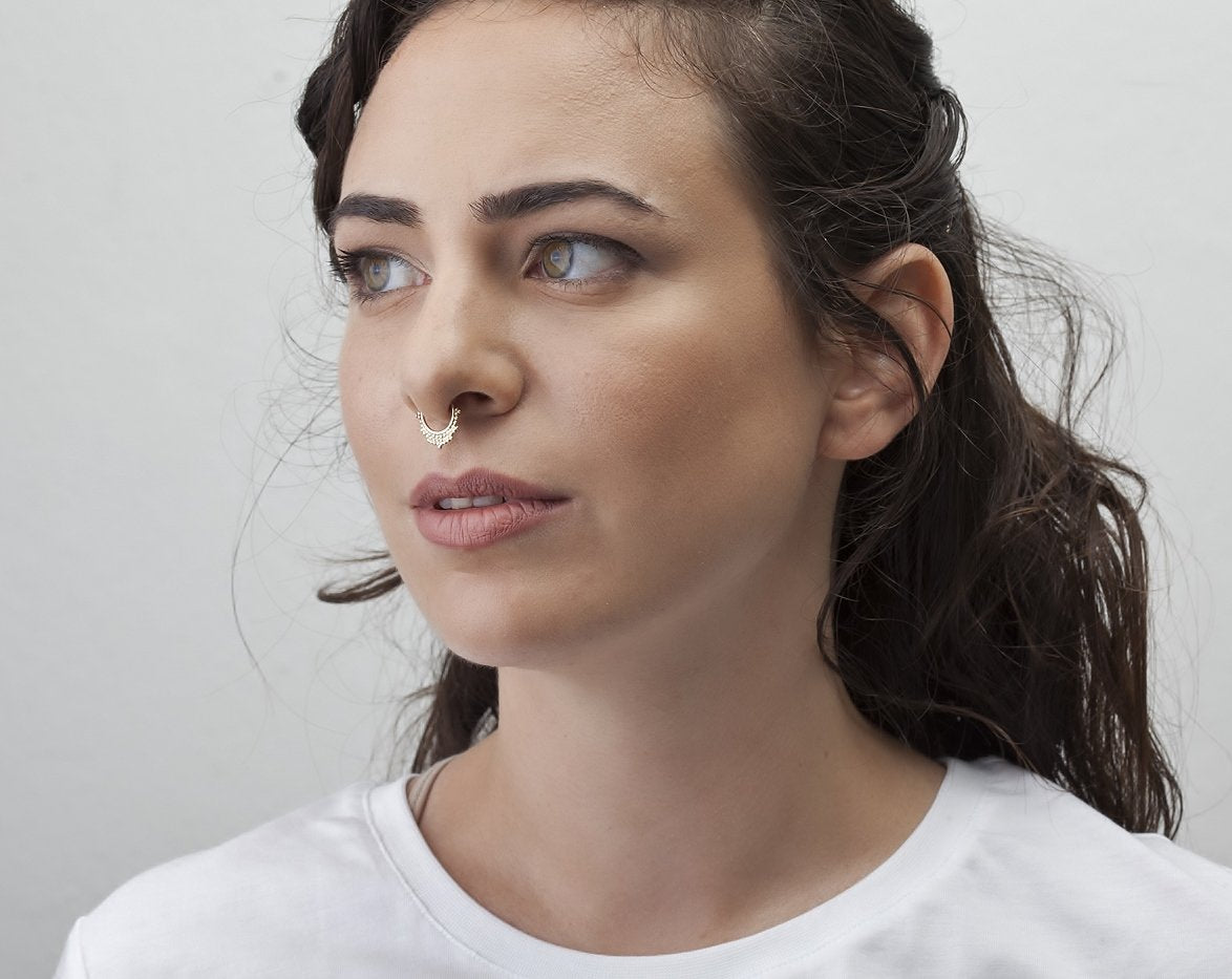 {"id":1498782826607,"title":"14k Gold Tribal Ornamental Septum Nose Jewelry - Priya","handle":"seppriya","description":"\u003ch2 class=\"ui-title-bar__title\"\u003e\u003cstrong\u003e14k Gold Tribal Ornamental Septum Nose Jewelry - Priya \u003c\/strong\u003e\u003c\/h2\u003e\n\u003ch3\u003e\u003cspan style=\"font-weight: 400;\"\u003eExpensive looking Priya is a very special and exclusive septum ring style. It is made of a symmetrical design of solid gold spheres, handcrafted to perfection. The ring is very light and easy to wear. It suits the septum and the nose piercings. You're going to enjoy wearing it!\u003c\/span\u003e\u003c\/h3\u003e\n\u003cp\u003e\u003cbr\u003e\u003c\/p\u003e\n\u003cp\u003e\u003cstrong\u003eFeatures:\u003c\/strong\u003e\u003c\/p\u003e\n\u003cul\u003e\n\u003cli style=\"font-weight: 400;\"\u003e\u003cspan style=\"font-weight: 400;\"\u003eCustom single handmade gold septum ring.\u003c\/span\u003e\u003c\/li\u003e\n\u003cli style=\"font-weight: 400;\"\u003e\u003cspan style=\"font-weight: 400;\"\u003eHandmade of hypoallergenic Pure 14k gold (No plating, NOT gold-filled).\u003c\/span\u003e\u003c\/li\u003e\n\u003cli style=\"font-weight: 400;\"\u003e\u003cspan style=\"font-weight: 400;\"\u003eDesign to impress multipurpose jewelry – suits most nose \u0026amp; ear piercings.\u003c\/span\u003e\u003c\/li\u003e\n\u003cli style=\"font-weight: 400;\"\u003e\u003cspan style=\"font-weight: 400;\"\u003eComes in a beautifully made jewelry box, ready to be offered as a gift.\u003c\/span\u003e\u003c\/li\u003e\n\u003cli style=\"font-weight: 400;\"\u003e\u003cspan style=\"font-weight: 400;\"\u003eCustomized for the best fit, the jewelry that suits your lifestyle.\u003c\/span\u003e\u003c\/li\u003e\n\u003c\/ul\u003e\n\u003cp\u003e\u003cbr\u003e\u003c\/p\u003e\n\u003cp\u003e\u003cstrong\u003e\u003cem\u003e- In need of a different size\u003cspan\u003e♦\u003c\/span\u003e Confused with sizing\u003cspan\u003e♦\u003c\/span\u003e Contact us now!\u003c\/em\u003e\u003c\/strong\u003e\u003c\/p\u003e\n\u003cp\u003e\u003cbr\u003e\u003c\/p\u003e","published_at":"2025-12-31T16:37:23+02:00","created_at":"2018-09-06T09:25:42+03:00","vendor":"Studio Meme - Dainty Tribal Jewelry","type":"Nose Jewelry","tags":["Ethnic","nose jewelry","nose piercings","Septum Jewelry","Statement Nose Jewelry"],"price":10600,"price_min":10600,"price_max":17400,"available":true,"price_varies":true,"compare_at_price":0,"compare_at_price_min":0,"compare_at_price_max":0,"compare_at_price_varies":false,"variants":[{"id":13354557046895,"title":"20ga (0.8 mm) \/ Small 9\/32 ″ (7 mm) \/ Solid 14k Yellow Gold","option1":"20ga (0.8 mm)","option2":"Small 9\/32 ″ (7 mm)","option3":"Solid 14k Yellow Gold","sku":"81-20\/7-YG","requires_shipping":true,"taxable":true,"featured_image":{"id":4144789389423,"product_id":1498782826607,"position":1,"created_at":"2018-09-06T09:25:42+03:00","updated_at":"2021-01-07T18:52:40+02:00","alt":null,"width":1600,"height":1067,"src":"\/\/studiomeme.jewelry\/cdn\/shop\/products\/Studio_Session-247_copy-1.jpg?v=1610038360","variant_ids":[13354557046895,13354557145199,13354557243503,13354557341807,13354557440111,13354557571183,13354557669487,13354557767791,13354557866095]},"available":true,"name":"14k Gold Tribal Ornamental Septum Nose Jewelry - Priya - 20ga (0.8 mm) \/ Small 9\/32 ″ (7 mm) \/ Solid 14k Yellow Gold","public_title":"20ga (0.8 mm) \/ Small 9\/32 ″ (7 mm) \/ Solid 14k Yellow Gold","options":["20ga (0.8 mm)","Small 9\/32 ″ (7 mm)","Solid 14k Yellow Gold"],"price":11400,"weight":0,"compare_at_price":0,"inventory_management":null,"barcode":null,"featured_media":{"alt":null,"id":832580124783,"position":1,"preview_image":{"aspect_ratio":1.5,"height":1067,"width":1600,"src":"\/\/studiomeme.jewelry\/cdn\/shop\/products\/Studio_Session-247_copy-1.jpg?v=1610038360"}},"requires_selling_plan":false,"selling_plan_allocations":[]},{"id":13354557079663,"title":"20ga (0.8 mm) \/ Small 9\/32 ″ (7 mm) \/ Solid 14k Rose Gold","option1":"20ga (0.8 mm)","option2":"Small 9\/32 ″ (7 mm)","option3":"Solid 14k Rose Gold","sku":"81-20\/7-RG","requires_shipping":true,"taxable":true,"featured_image":{"id":4144789422191,"product_id":1498782826607,"position":2,"created_at":"2018-09-06T09:25:42+03:00","updated_at":"2021-01-07T18:52:40+02:00","alt":null,"width":1600,"height":1067,"src":"\/\/studiomeme.jewelry\/cdn\/shop\/products\/rose1.jpg?v=1610038360","variant_ids":[13354557079663,13354557177967,13354557276271,13354557374575,13354557472879,13354557603951,13354557702255,13354557800559,13354557898863]},"available":true,"name":"14k Gold Tribal Ornamental Septum Nose Jewelry - Priya - 20ga (0.8 mm) \/ Small 9\/32 ″ (7 mm) \/ Solid 14k Rose Gold","public_title":"20ga (0.8 mm) \/ Small 9\/32 ″ (7 mm) \/ Solid 14k Rose Gold","options":["20ga (0.8 mm)","Small 9\/32 ″ (7 mm)","Solid 14k Rose Gold"],"price":11400,"weight":0,"compare_at_price":0,"inventory_management":null,"barcode":null,"featured_media":{"alt":null,"id":832580157551,"position":2,"preview_image":{"aspect_ratio":1.5,"height":1067,"width":1600,"src":"\/\/studiomeme.jewelry\/cdn\/shop\/products\/rose1.jpg?v=1610038360"}},"requires_selling_plan":false,"selling_plan_allocations":[]},{"id":13354557112431,"title":"20ga (0.8 mm) \/ Small 9\/32 ″ (7 mm) \/ Solid 14k White Gold","option1":"20ga (0.8 mm)","option2":"Small 9\/32 ″ (7 mm)","option3":"Solid 14k White Gold","sku":"81-20\/7-WG","requires_shipping":true,"taxable":true,"featured_image":{"id":4144789454959,"product_id":1498782826607,"position":3,"created_at":"2018-09-06T09:25:42+03:00","updated_at":"2021-01-07T18:52:40+02:00","alt":null,"width":1600,"height":1067,"src":"\/\/studiomeme.jewelry\/cdn\/shop\/products\/white_gold_1.jpg?v=1610038360","variant_ids":[13354557112431,13354557210735,13354557309039,13354557407343,13354557538415,13354557636719,13354557735023,13354557833327,13354557931631]},"available":true,"name":"14k Gold Tribal Ornamental Septum Nose Jewelry - Priya - 20ga (0.8 mm) \/ Smal