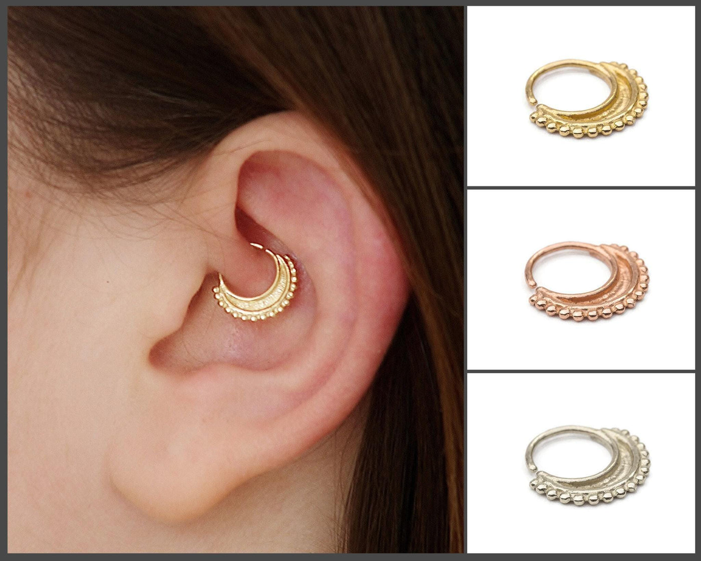 These 14K gold daith earrings are designed to combine delicate tribal piercing jewelry with lasting comfort and style. Crafted from solid 14k nickel-free gold, these daith hoop earrings provide hypoallergenic protection, making them ideal for sensitive skin. Perfect for anyone seeking small gauge earrings, these comfort fit hoops suit helix piercing hoops, tragus, rook, and nose piercings. Custom size hoops with inner diameters up to 9mm ensure a precise fit for every wearer.