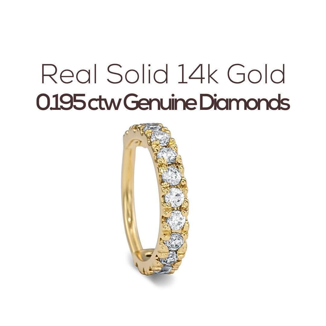 This cartilage hoop earring offers a delicate circle of light designed to enhance your ear with subtle elegance. Crafted from 14k gold earrings in yellow, rose, or white tones, this piece features a diamond accent hoops design that adds a refined shimmer to your look. The cartilage hoop earring is set with 13 small diamond earrings totaling 0.13 carats of conflict free diamonds, ensuring ethical beauty worn close to the skin. Made from nickel free gold jewelry, it comes in your choice of rose gold cartilage hoop, white gold hoop earrings, or yellow gold hoops, available in 18 gauge cartilage hoop (1 mm) or 16 gauge (1.2 mm) with an 8 mm inner diameter for a comfortable fit.