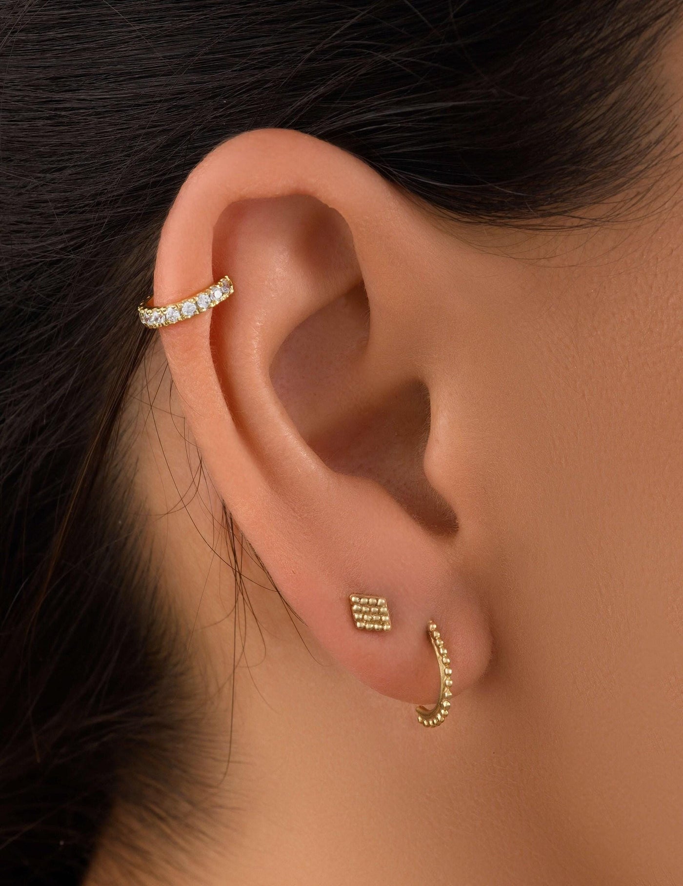 Each delicate gold hoops piece is thoughtfully handmade to rest lightly yet securely on your ear's cartilage, creating a subtle shimmer that moves naturally with you throughout the day. The diamond accent hoops design highlights the beauty of small diamond earrings while ensuring durability and comfort.