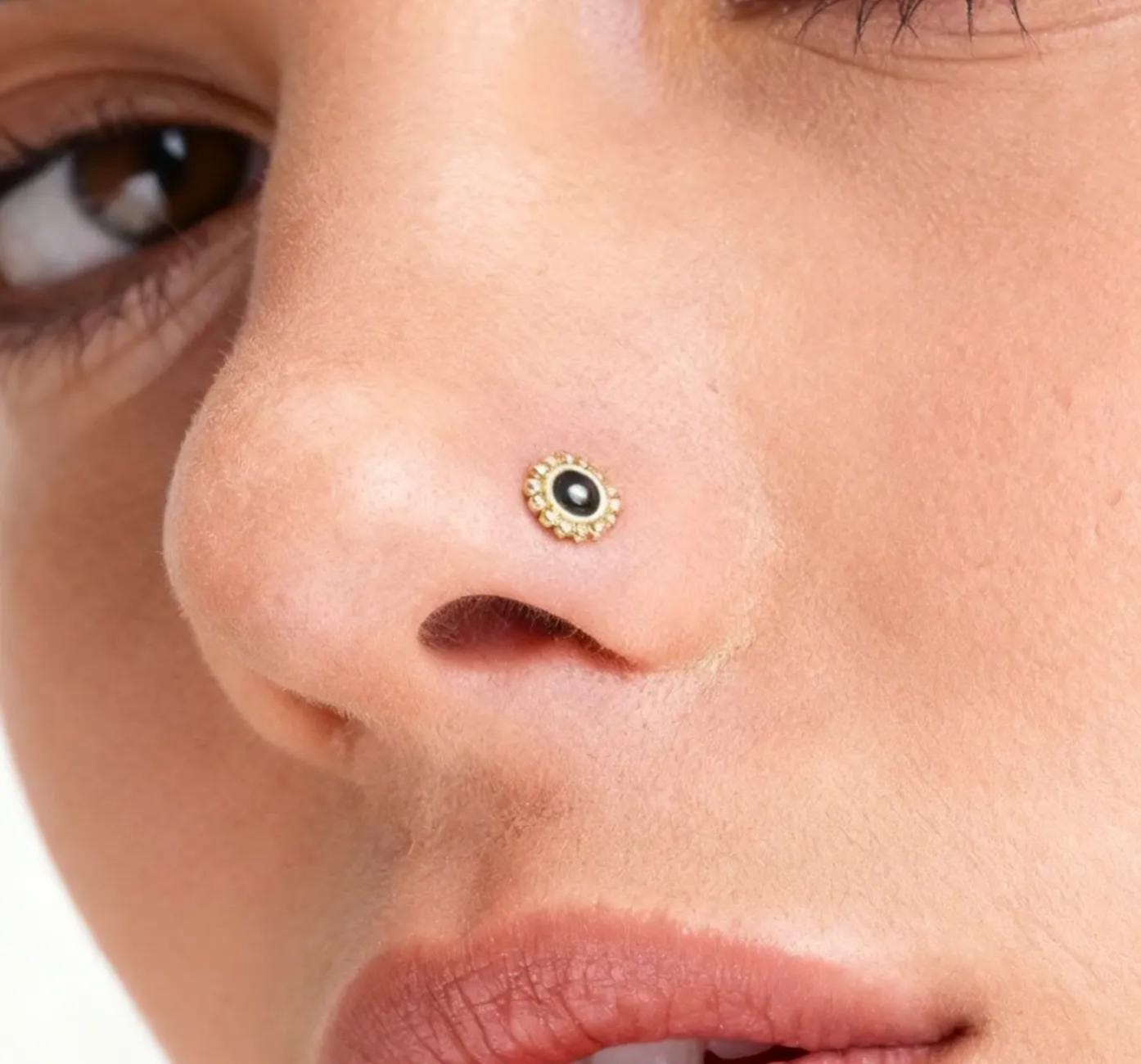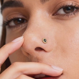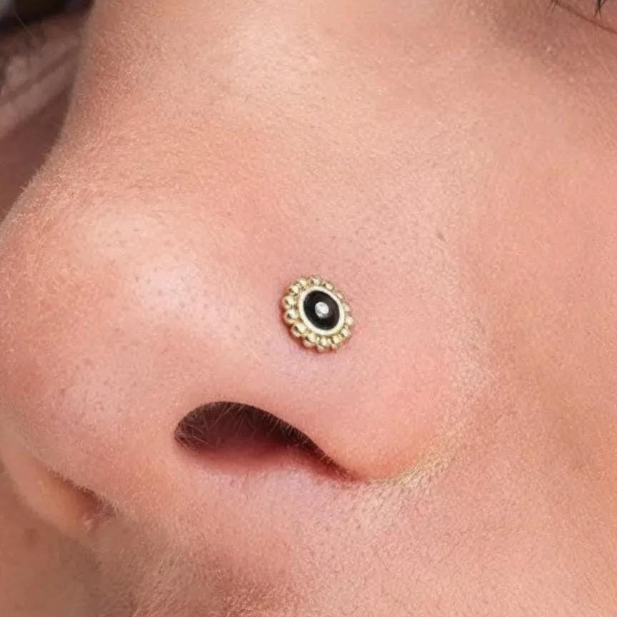 This 14K gold nose stud features a tribal sun design in solid 14K yellow gold with black enamel, offering a unique and elegant nose piercing jewelry piece that enhances your natural beauty while ensuring durability and comfort. Crafted as a delicate nose ring, this Indian style nose pin delivers a subtle yet striking accent, perfect for those seeking a refined solid gold nose accessory. The stud is nickel free gold jewelry, making it safe for sensitive skin and suitable for various types of piercings including nostril and cartilage.