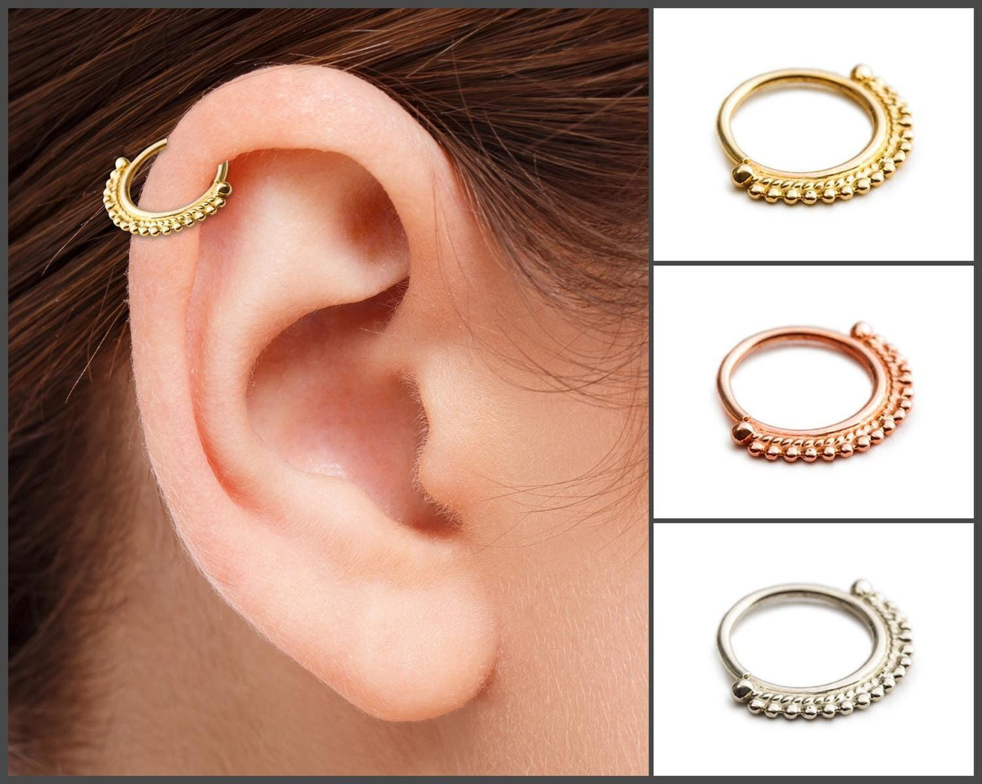 This 14k gold cartilage hoop is crafted to bring both elegance and durability to your piercing collection. Designed for helix, daith, tragus, nose, and septum piercings, this solid gold hoops piece delivers a perfect balance of style and comfort. Made from solid 14k gold available in yellow, rose, or white gold, this cartilage piercing ring offers hypoallergenic qualities that protect sensitive skin while providing a tribal style earrings look that complements any outfit.