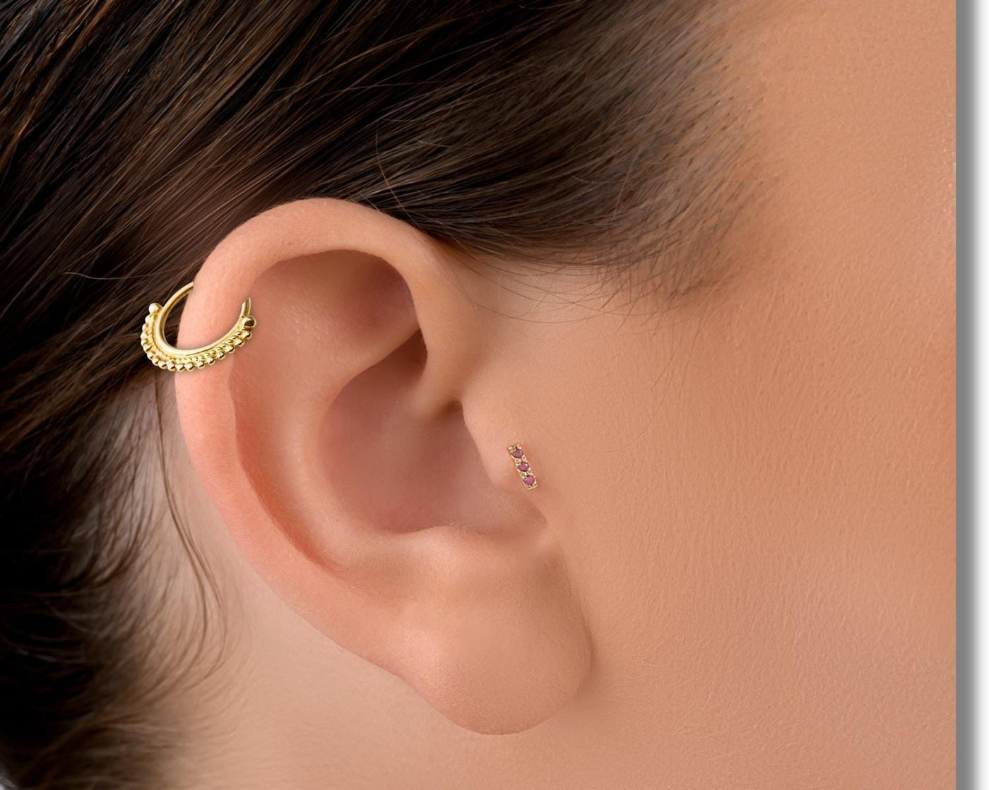 Each 14k gold cartilage hoop is made to order by Studio Meme, a piercing jewelry boutique devoted to crafting dainty tribal style earrings forged from solid gold and sterling silver. Our pieces carry the quiet strength of earth and fire—designed not just as jewelry but as personal symbols of heritage and self-expression. All orders shipping to the US go through our distributor with no extra duties or taxes upon delivery.