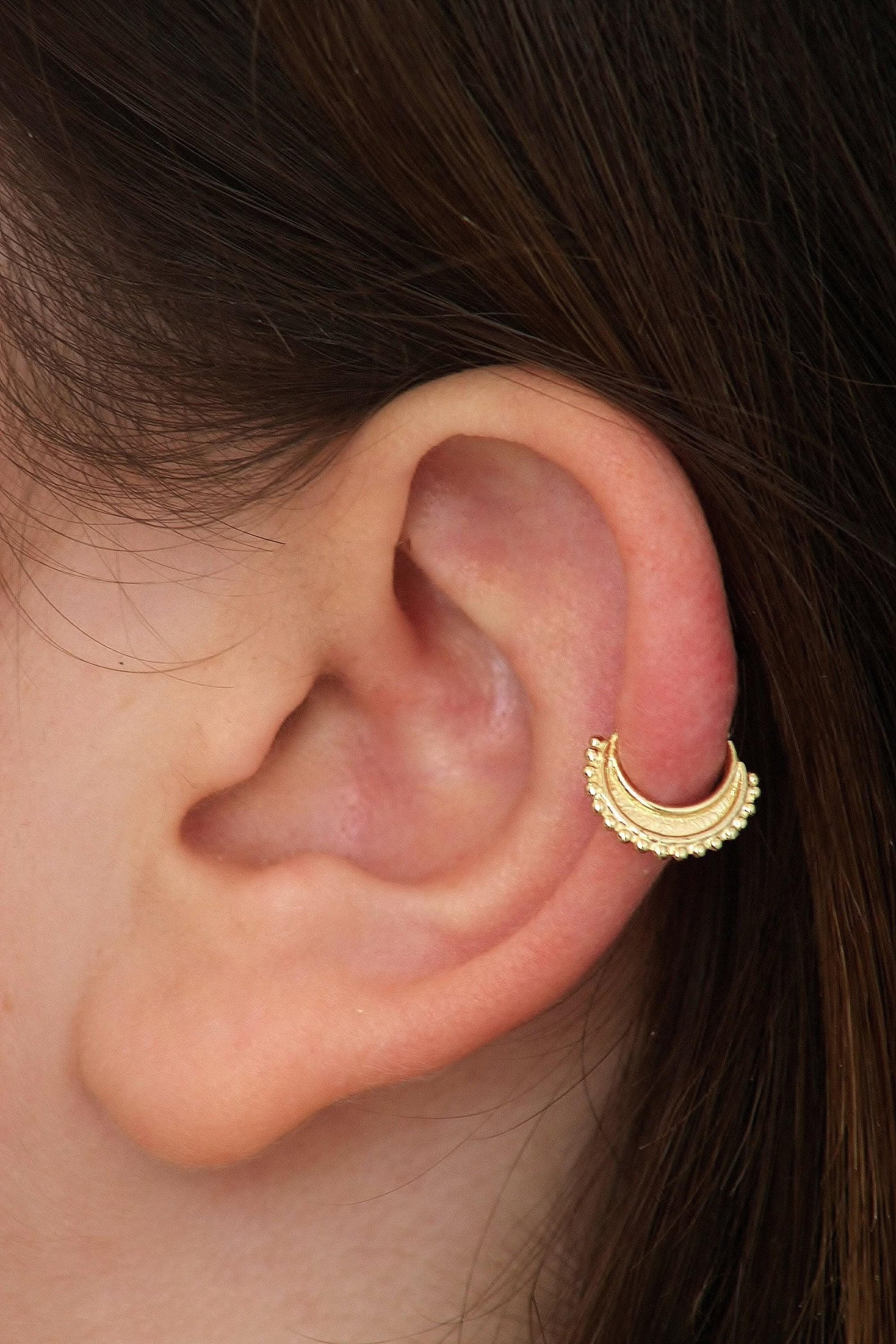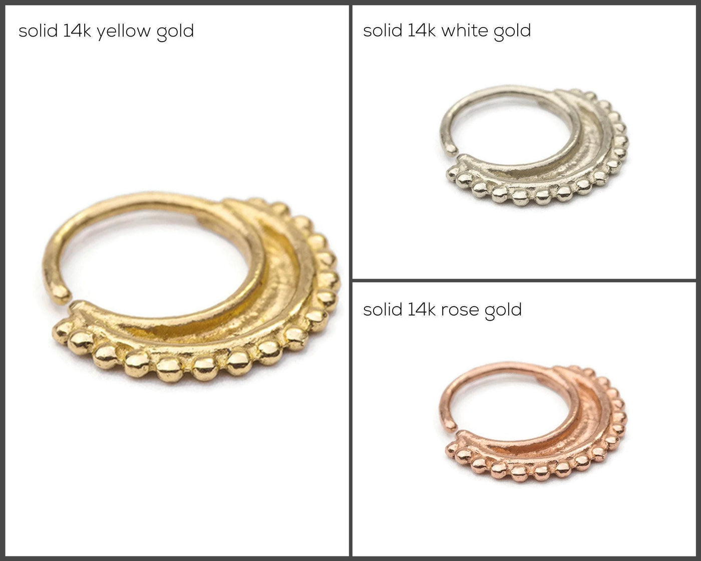 This solid 14k gold nose ring offers a delicate yet durable accessory designed specifically for cartilage piercings, including daith and nostril placements. Crafted from nickel-free solid 14k gold, this cartilage nose ring blends the warmth of yellow, rose, or white gold with the intricate beauty of Indian style nose rings. The lightweight design ensures comfortable wear while providing a secure fit that enhances your natural look. Wearing this handmade solid gold piece delivers a subtle glow and lasting quality, backed by Studio Meme’s commitment to craftsmanship and authenticity.