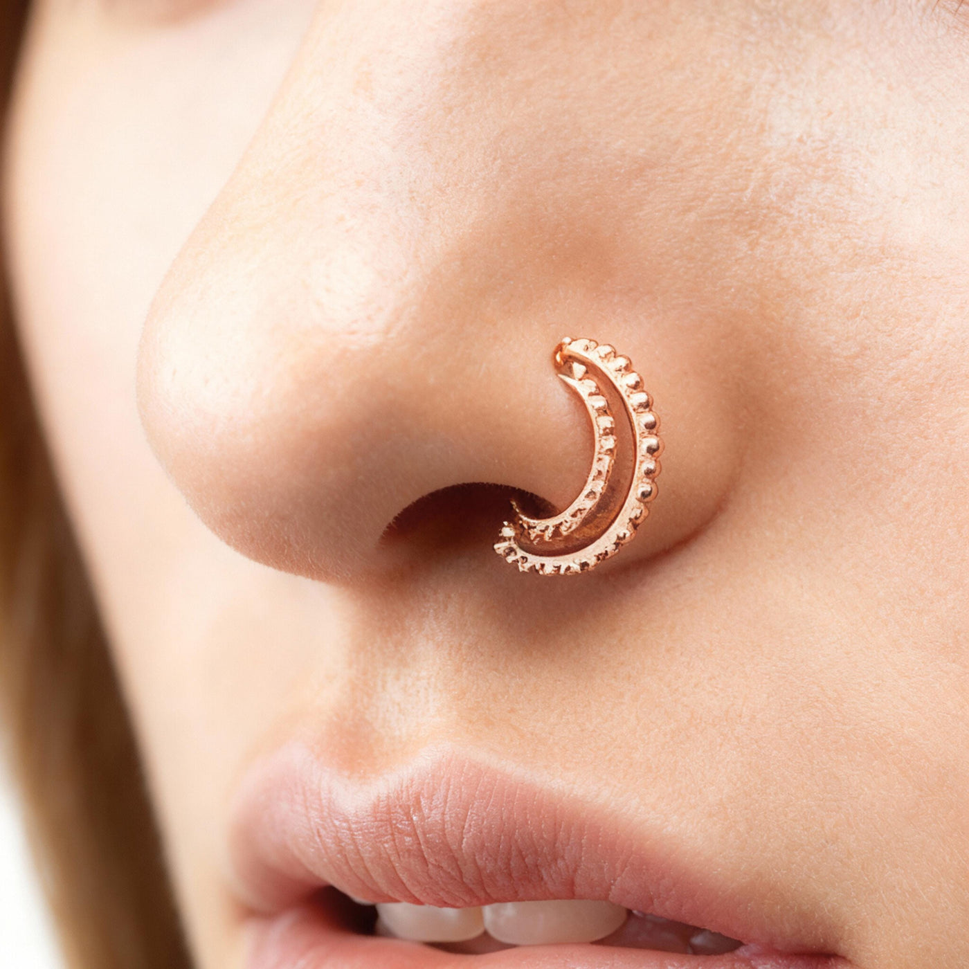 Expand your collection today with this exquisite tribal nose jewelry crafted from solid gold that combines style with comfort and durability. Perfect as a gift or personal treat, this handmade rose gold nostril ring will be your new favorite accessory.