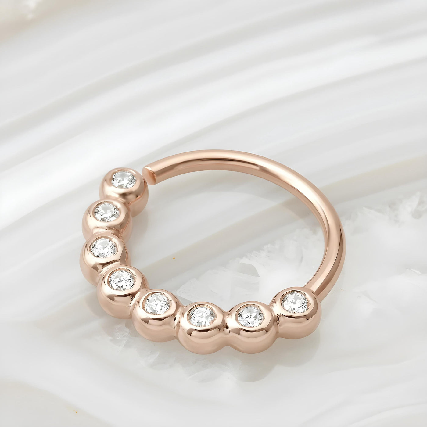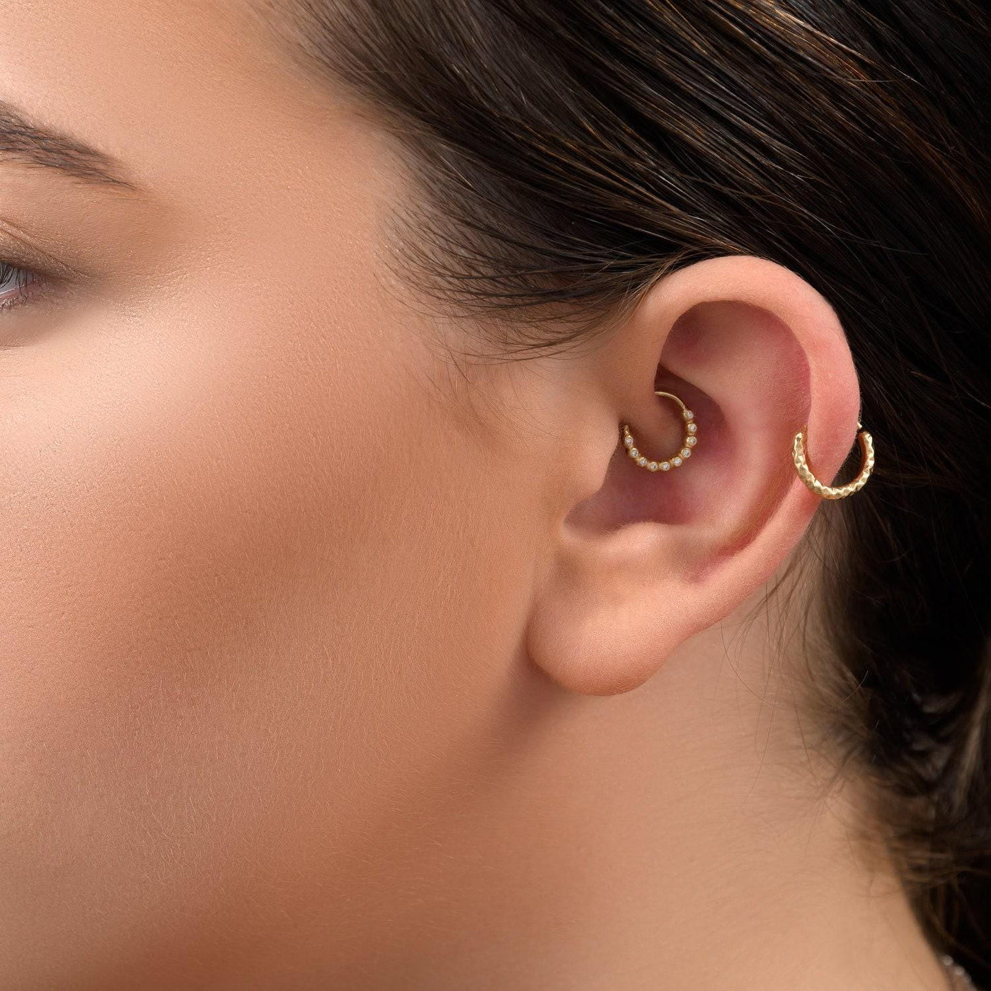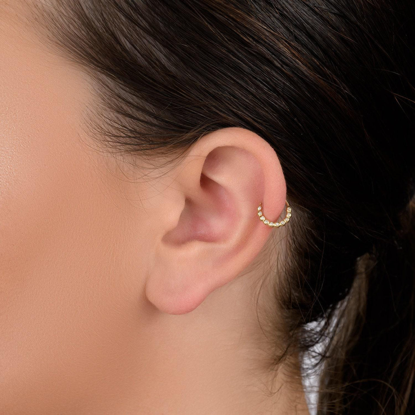 The 14k gold hoop is adorned with 8 to 10 bezel set diamonds, each approximately 1mm in size, totaling around 0.05 carats. Available in thicknesses of 20g, 18g, or 16g and inner diameters of 7mm, 8mm, or 9mm, this solid gold piercing fits comfortably in nostril, septum, cartilage, tragus, helix, rook, daith, and conch piercings. The thickness (gauge) affects wire diameter inside the piercing, while the inner diameter controls how close the hoop sits against your skin.