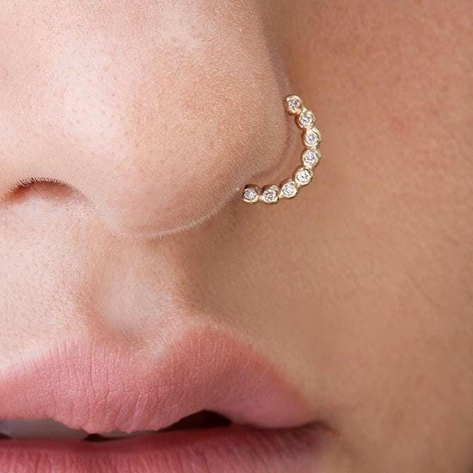 Diamond Nose Ring - Solid 14K Gold Hoop With Bezel Set Diamonds, Dainty Jewelry