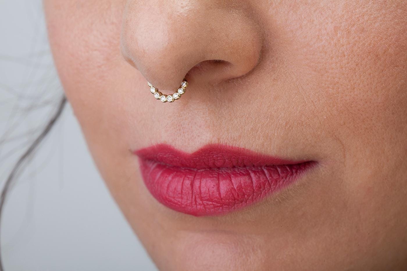 Each nose ring is handmade to order by Studio Meme, a boutique dedicated to crafting unique nose jewelry inspired by tribal designs and personal expression. The delicate bezel set diamonds add a quiet shimmer that enhances your natural beauty without overpowering it. This diamond nose ring has been tested for hypoallergenic wear and durability to ensure it complements your lifestyle effortlessly.